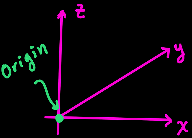 Often, one sees the coordinate frame with three vectors meeting at a point called the origin. Like this,
