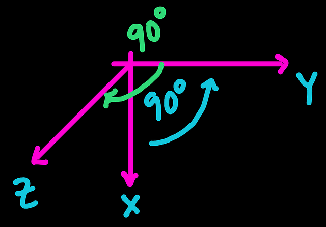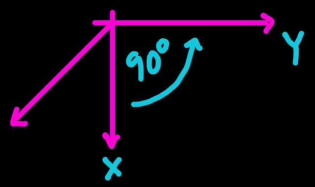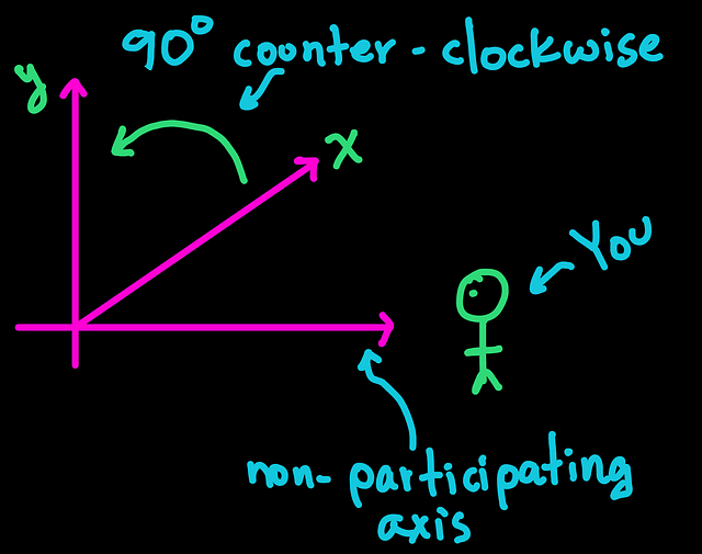 Step 3. We move to the next axis by going 90 deg in a counter-clockwise direction. The axis that we reached will be named with the next label. Y in this case.