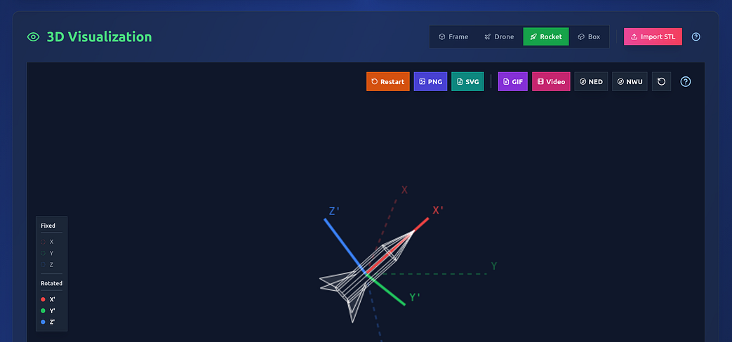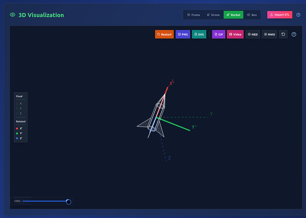 Numerical correctness alone is often insufficient for developing intuition. Rotation Converter includes an interactive 3D viewer that renders the orientation of a rigid body, including its coordinate axes.