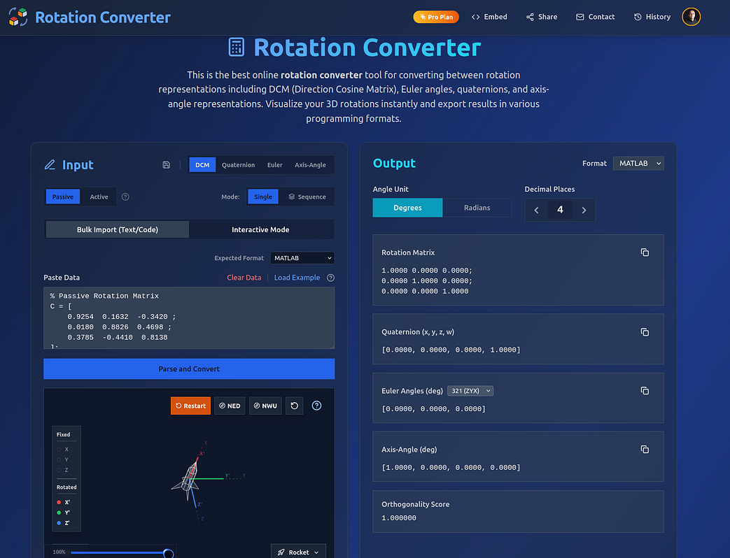 The central feature of Rotation Converter is a synchronized input–output layout. A rotation entered in one representation — Euler angles, quaternion, DCM, or axis–angle — is immediately converted and displayed in all others.